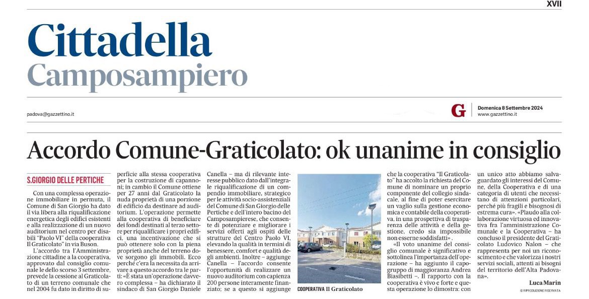 Accordo Comune – Graticolato Il Mattino di Padova del 8 settembre 2024 Condividi Scopri altri Articoli Permuta tra Comune e Coop Dicono di Noi / 5 Settembre 2024 Disabilità e Lavoro Dicono di Noi / 22 Dicembre 2024 Inclusione e Lavoro: Nuove Opportunità a Camposampiero Dicono di Noi / 17 Gennaio 2024